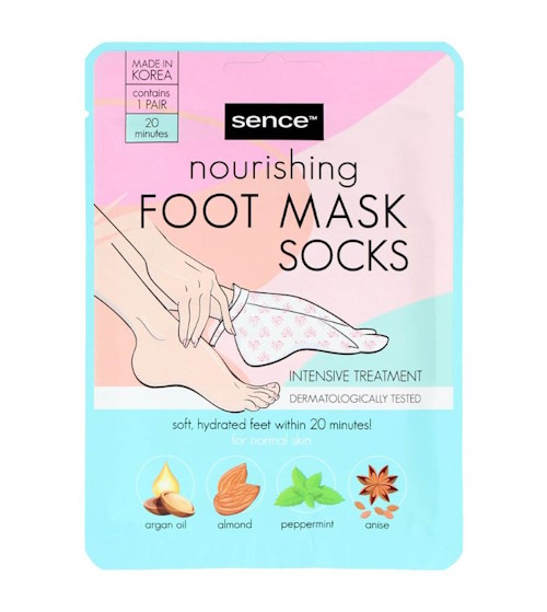 Sence kosteuttava jalkanaamio on intensiivinen hoito jaloille, jotka kaipaavat hieman rakkautta ja huolenpitoa. Koostumus on dermatologisesti testattu, ja se ravitsee, kosteuttaa ja pehmentää kuivia ja väsyneitä jalkoja. Vedä vain "sukat" jalkaasi ja anna naamion tehdä taikansa! Sisältää E-vitamiinia, karitevoita, manteliuutetta, arganöljyä, aniksen siemeniä ja rosmariiniuutetta. Jalkanaamio tekee jaloista silkkisen pehmeät. Tämä jalkanaamio tarjoaa sinulle korealaisen kauneudenhoidon parhaat puolet mukavasti omassa kodissasi.