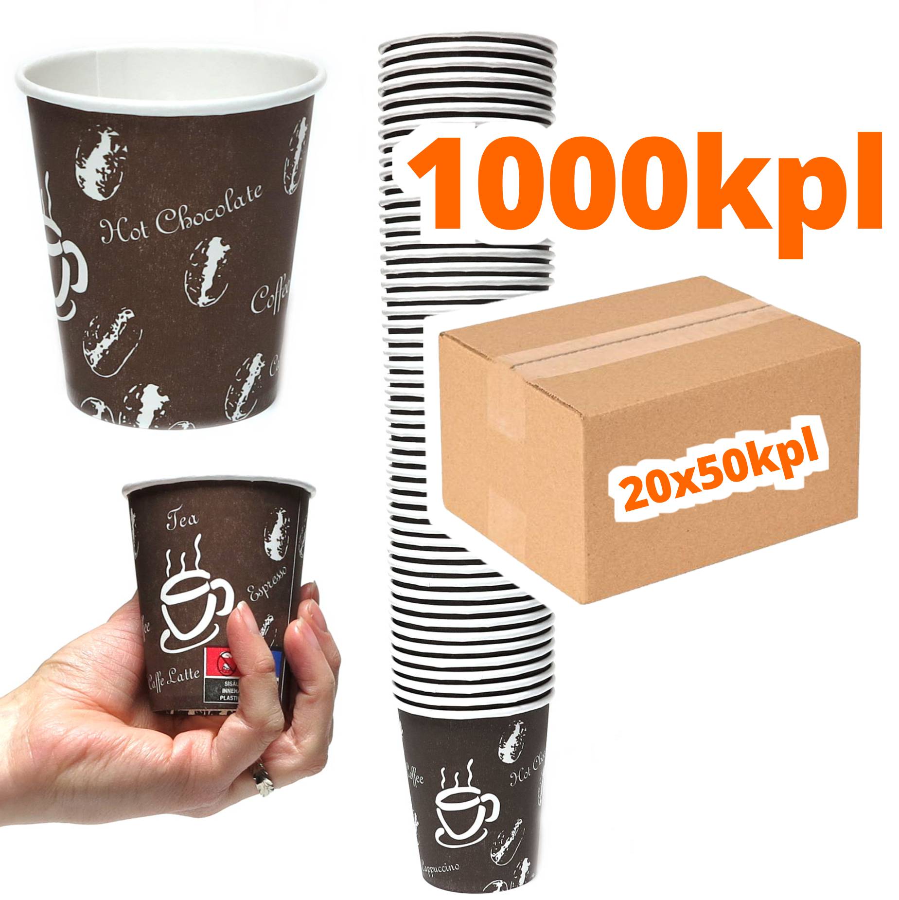 Tukevia kertakäyttöisiä kahvikuppeja. Pakkaus sisältää 20 x 50kpl. Tilavuus 200ml. Kahvikupin ulkopinta ruskea ja "Chocolate" tms tekstit printattuna.