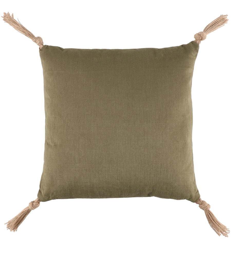 Koristetyyny puuvillamateriaalia juutti tupsuilla. Käsinpesu.