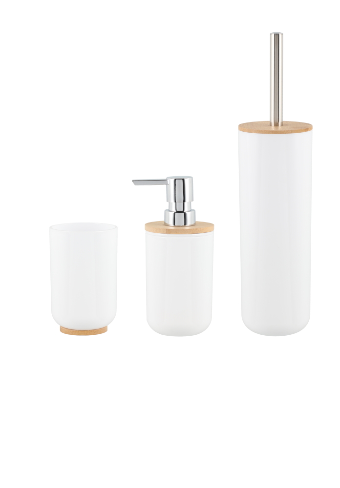 Valkoinen kylpyhuonetarvikesetti, jossa kolme osaa: pumppupullo 300 ml, jossa bambukansi ja muovinen pumppuosa kromiviimeistelyllä, hammasharjamuki, jossa bambupohja, vessaharjateline, jossa bambukansi.
