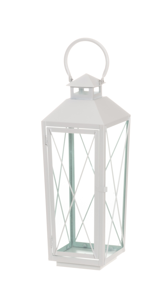 Kaunis valkoinen lyhty, jonka voi ripustaa tai asettaa tasaselle alustalle.