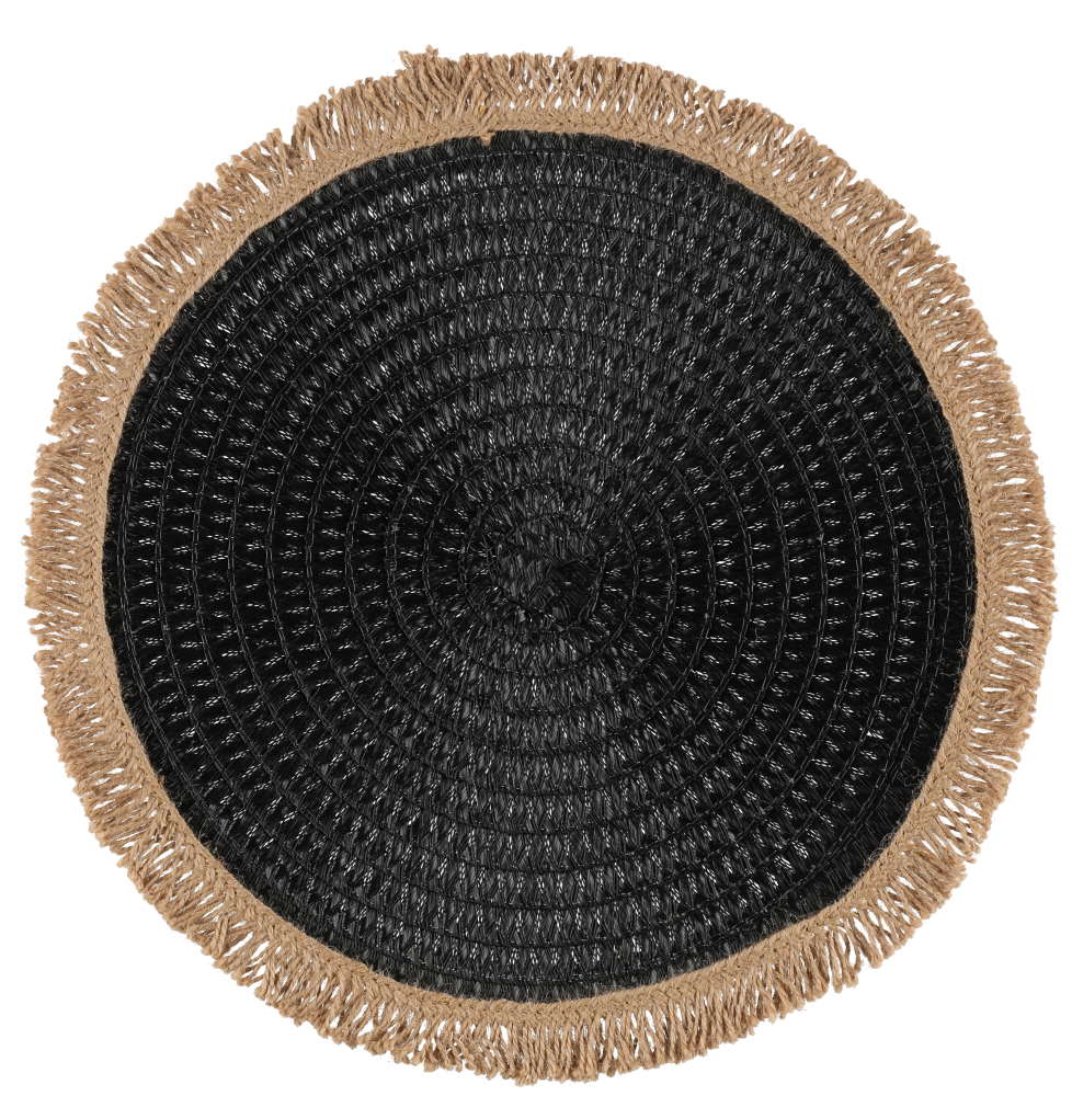 Pyöreä tabletti juuttihapsuilla. Halkaisija 43cm. Väri musta/natural.