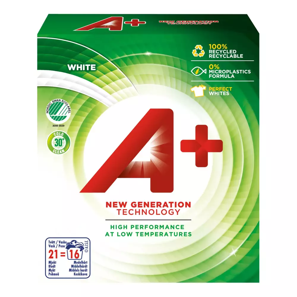 A+ White pyykinpesujauhe on valkopyykille tarkoitettu pesuaine, joka puhdistaa tehokkaasti myös 30 asteen pesulämpötilassa. Joutsenmerkitty pesuaine auttaa pitämään valkoiset tekstiilit puhtaina ja raikkaina pesusta toiseen.