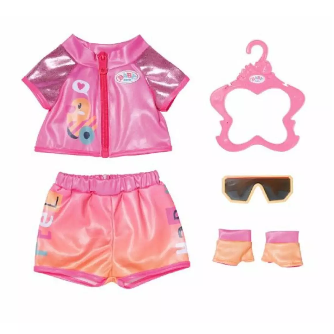 BABY born urheilullinen pyöräilyasu pyörällä tai kolmipyörällä ajeluun. Asuun kuuluu pinkki paita, shortsit, ajohanskat ja -lasit, mukana myös henkari.