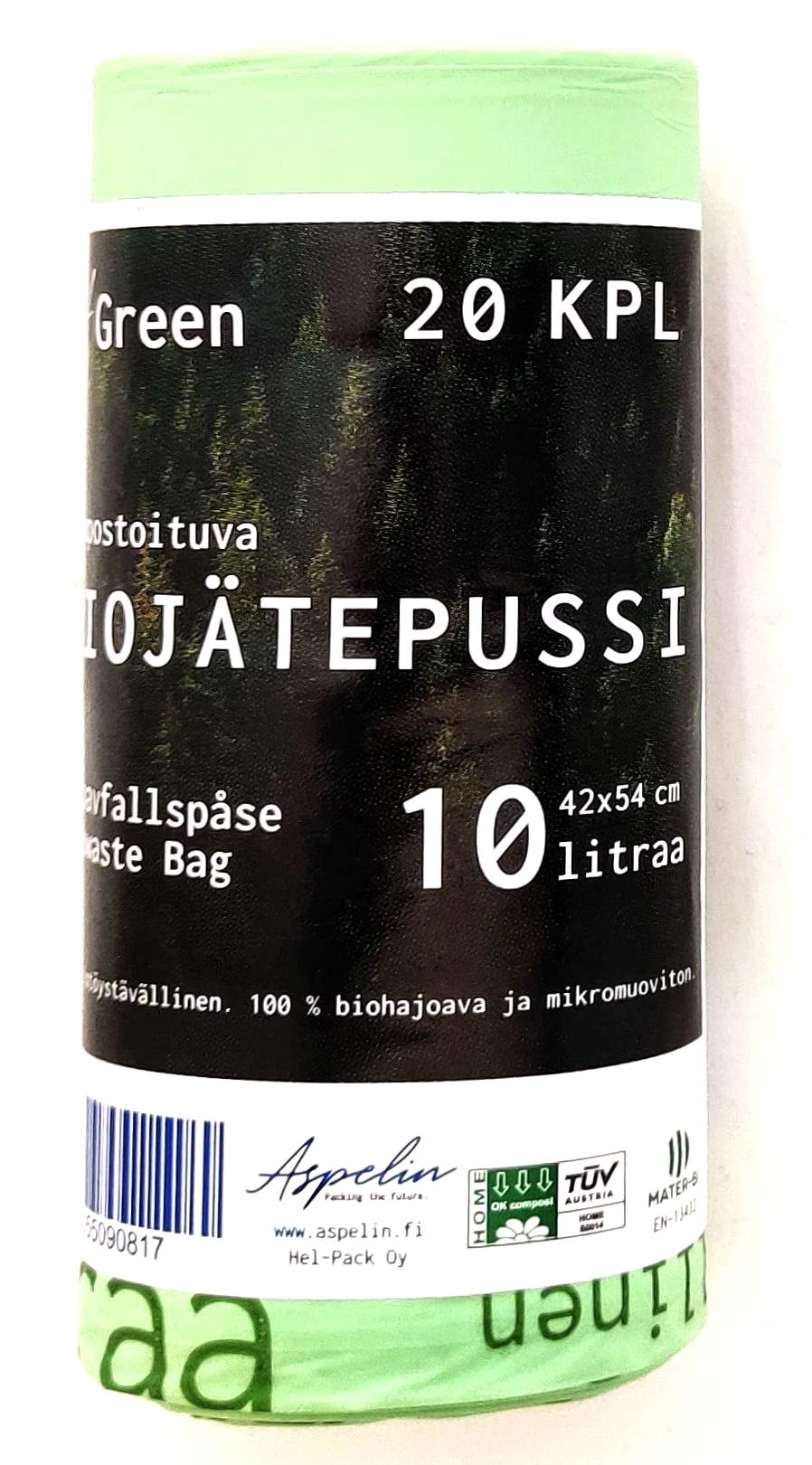 A. Green biojätepussi kotikompostiin 10 litraa. Koko 42x54 cm, vahvuus 15 my. Valmistettu sertifioidusta kotikompostissa hajovasta mater-bi bio kalvosta. Rullassa 20 kpl.
