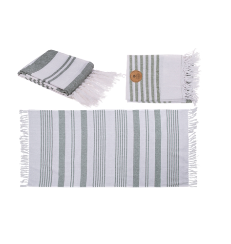 Suurikokoinen hamam pyyhe. Väri valkoinen/vihreä. 80%puuvillaa 20% polyesteriä.