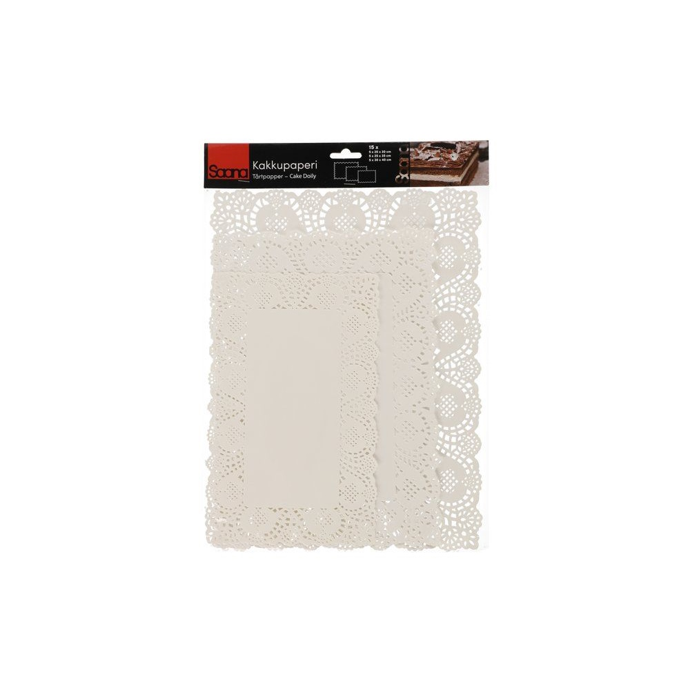 Valkoinen suorakaiteen muotoinen kakkupaperi jossa pitsimäiset reunat. Pakkauksessa 15 kakkupaperia, kolme eri kokoa: 20 x 30 cm 5 kpl, 25 x 35 cm 5 kpl, 30 x 40 cm 5 kpl.