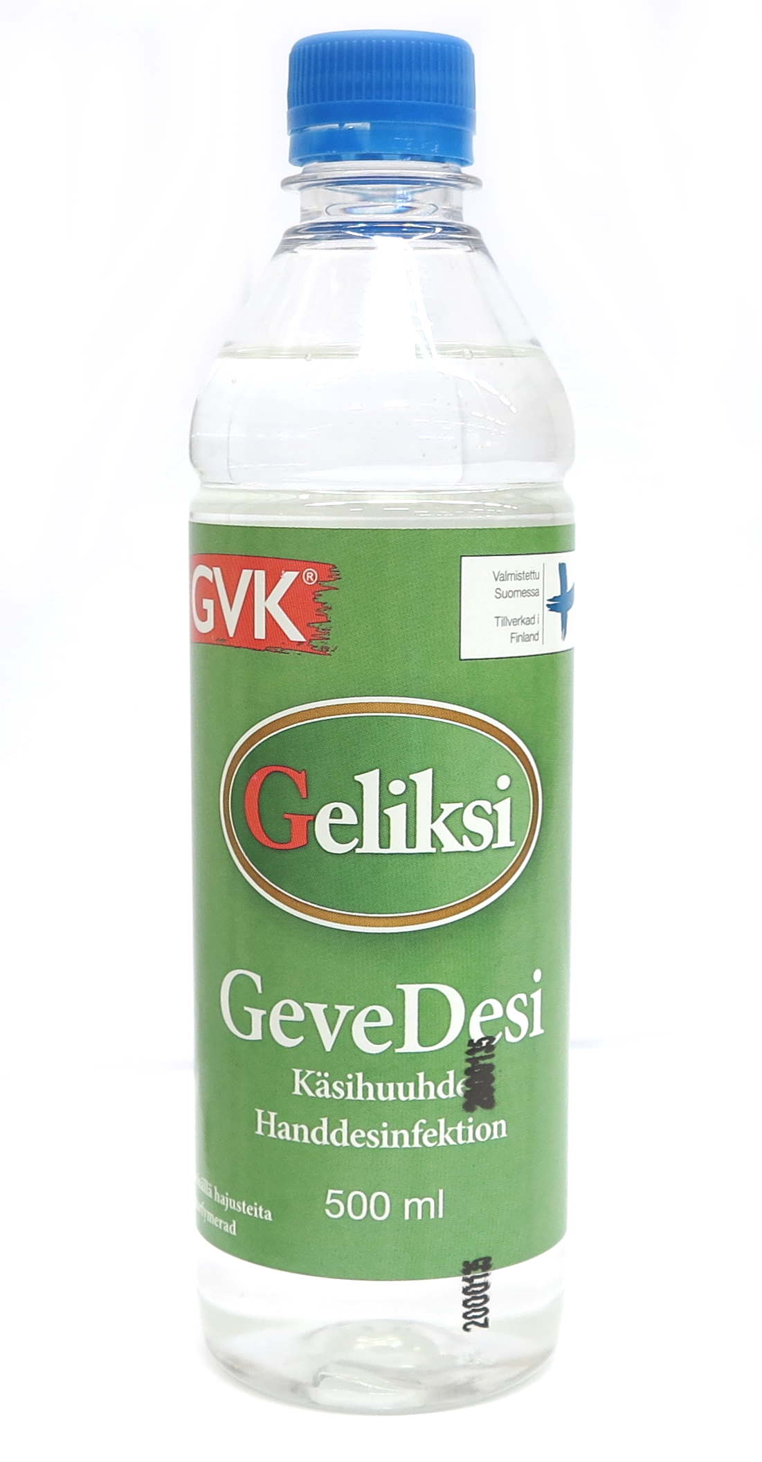 Kotimainen käsidesi ns. ketsuppipullokorkilla. Ison pullon voi annostella pienempiin pulloihin, esim. pumppupullo. Geliksi GeveDesi käsihuuhde desinfioi kätesi bakteereista turvallisesti. Se sisältää 60-70 % denaturoitua etanolia sekä hoitavaa glyseriiniä eli ei kuivata ihoa. Annostele kuiviin käsiin runsaasti ja hiero käsi niin kauan kunnes huuhde on kokonaan kuivunut.