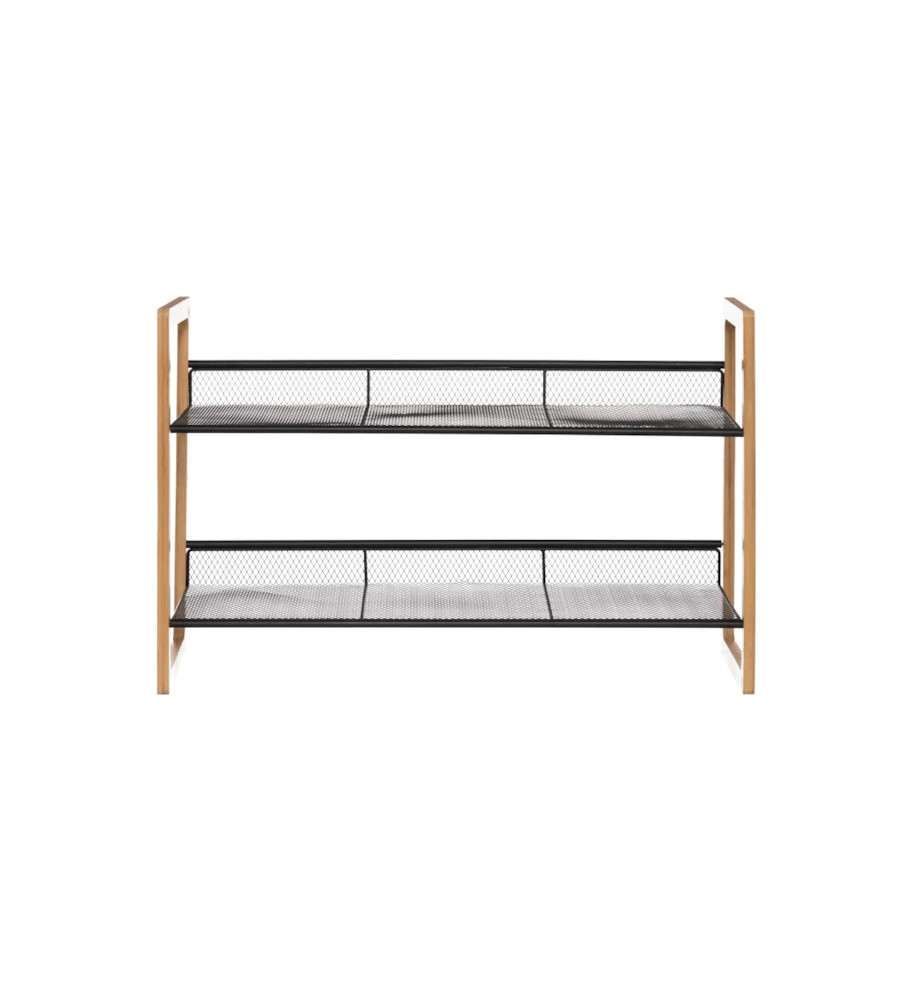 Emmi kenkätelineen runko on luonnollisen väristä bambua ja hyllyt mustaksi maalattua metalliverkkoa. Hyllyjen takaosassa on pieni reuna, joten kengät eivät pääse tipahtamaan. Kenkäteline on pinottava, jos haluat tuplata säilytystilan, aseta kaksi kenkätelinettä päällekkäin. Enimmäiskantavuus 2 kg/hylly. Verkkomateriaali vähentää pölyn kertymistä ja säilöö kenkäsi ilmavasti.