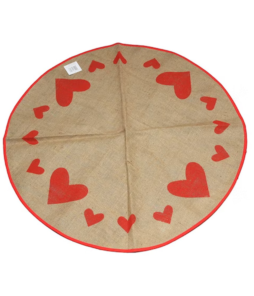Juuttikankainen kuusenalusmatto, jossa sydänkoristelu. Alapuoli muovitettu. Maton halkaisija 95 cm.
