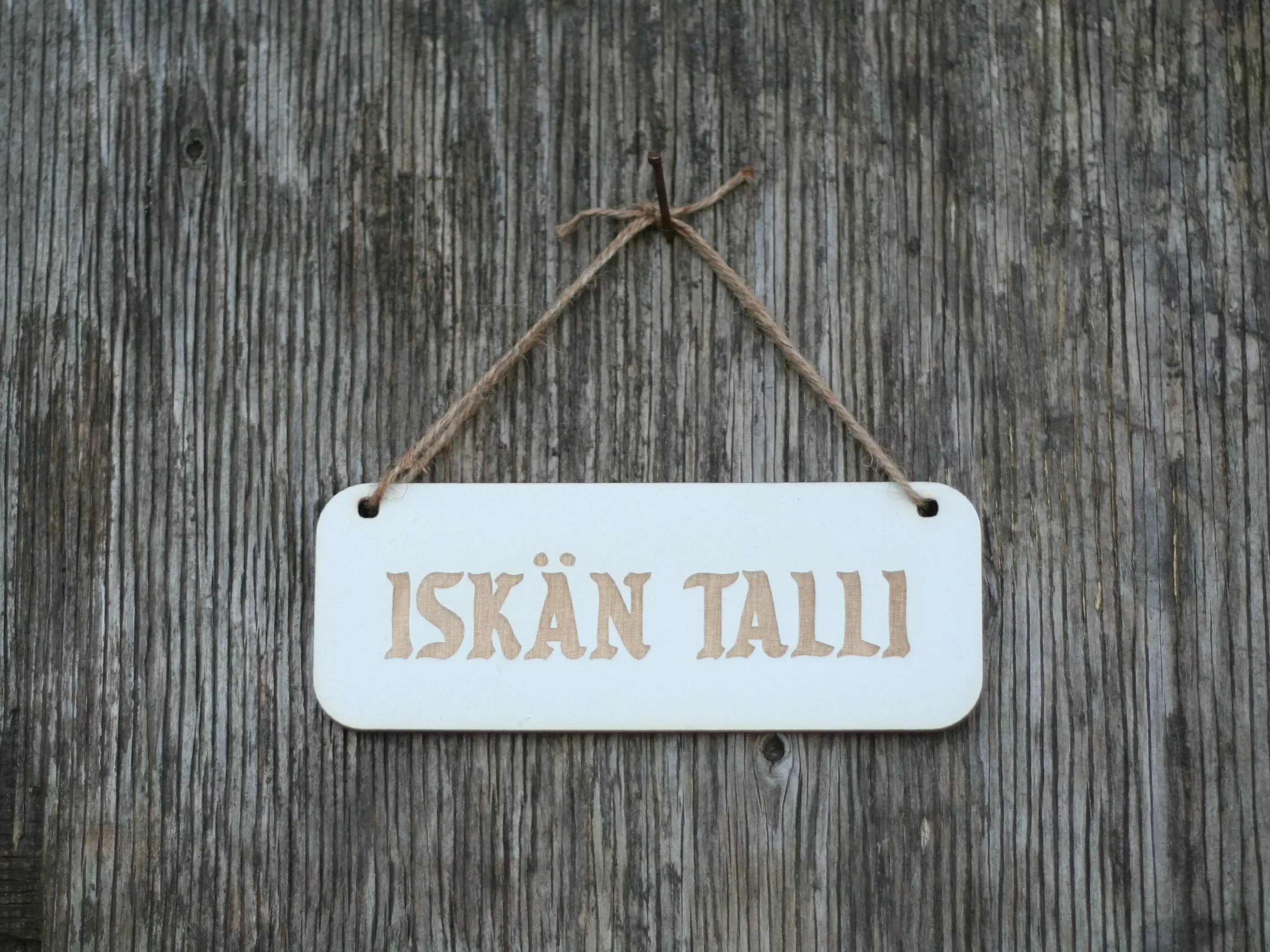 KYLTTI Iskän Talli valk Puinen kyltti hauskalla tekstillä. Suomessa valmistettu puinen kyltti on hauska sisustus- tai lahjaidea. Kotimainen tuote!