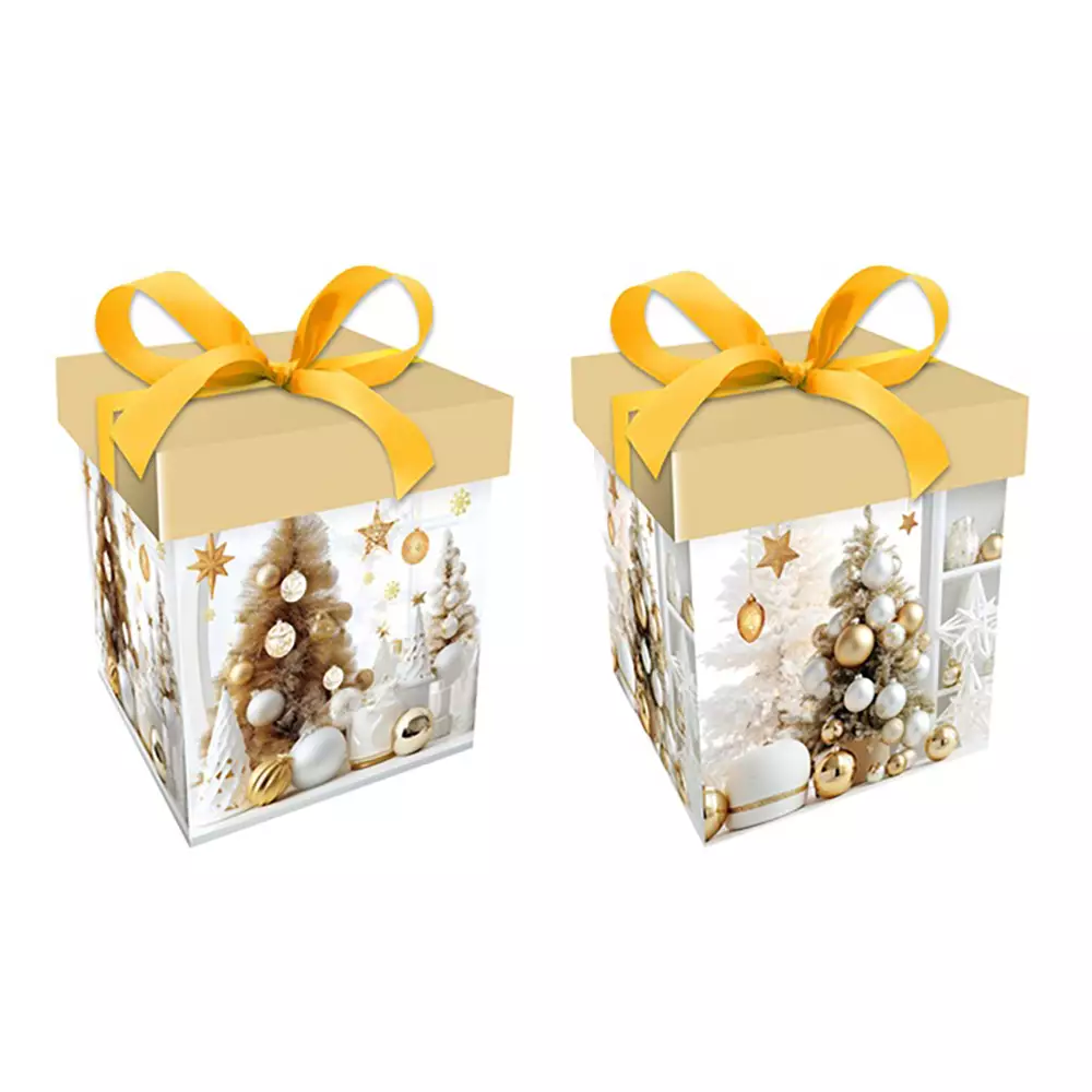 Tyylikäs ja kestävä lahjalaatikko jouluisiin yllätyksiin. Laatikko on valmistettu 300 g valkoisesta pahvista ja siinä on kaunis kultasävyinen kansi. Pieni laatikko sopii erinomaisesti pienten lahjojen, makeisten tai koristetavaroiden paketointiin.