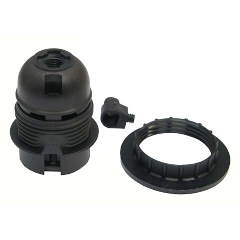 Kierteellä, renkaalla, vedonpoistonipalla ja E27-kannalla varustettu lampunpidin. M10 kierre. Jousiliittimet.