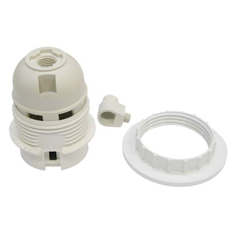 Kierteellä, renkaalla, vedonpoistonipalla ja E27-kannalla varustettu lampunpidin. M10 kierre. Jousiliittimet.