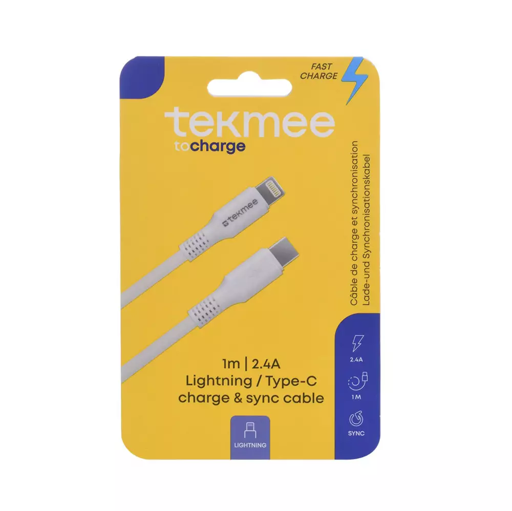 Tekmee Lightning / USB-C -latausjohto mahdollistaa nopean ja turvallisen latauksen sekä tiedonsiirron Apple-laitteille, joissa on Lightning-liitäntä. USB-C -pään ansiosta kaapeli sopii suoraan moderneihin latureihin ja virtalähteisiin. 2.4A virran ansiosta lataus sujuu tehokkaasti.
