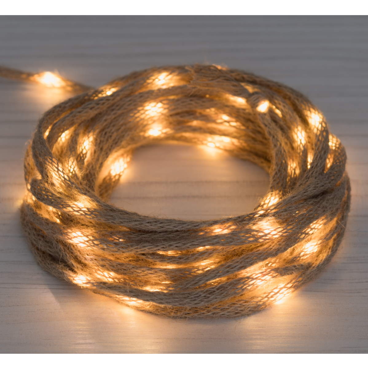 Kaunis juuttinaruun upotettu valoketju. LEDEin valaistulla juuttinarulla saa helposti loihdittua tyylikkäitä yksityiskohtia sisätiloihin.
