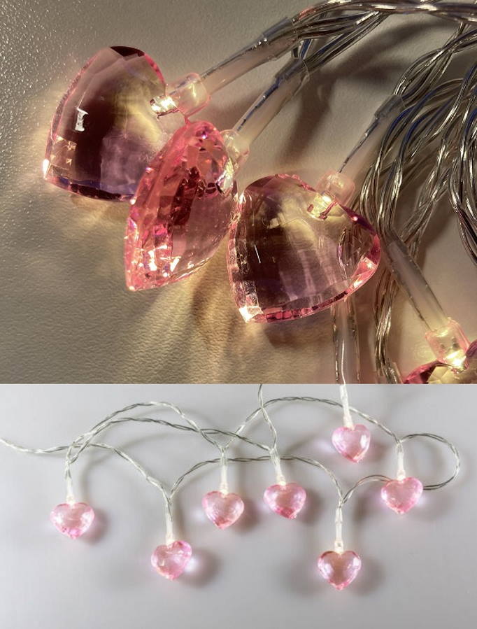 PINKKI, 20 lämmin valkoinen LED, pinkit pienet sydämet 2.5x2cm, lampunväli 10 cm, kirkas liitosjohto 50 cm, 3xAA -paristot, ei sis., AJASTIN 6/18H