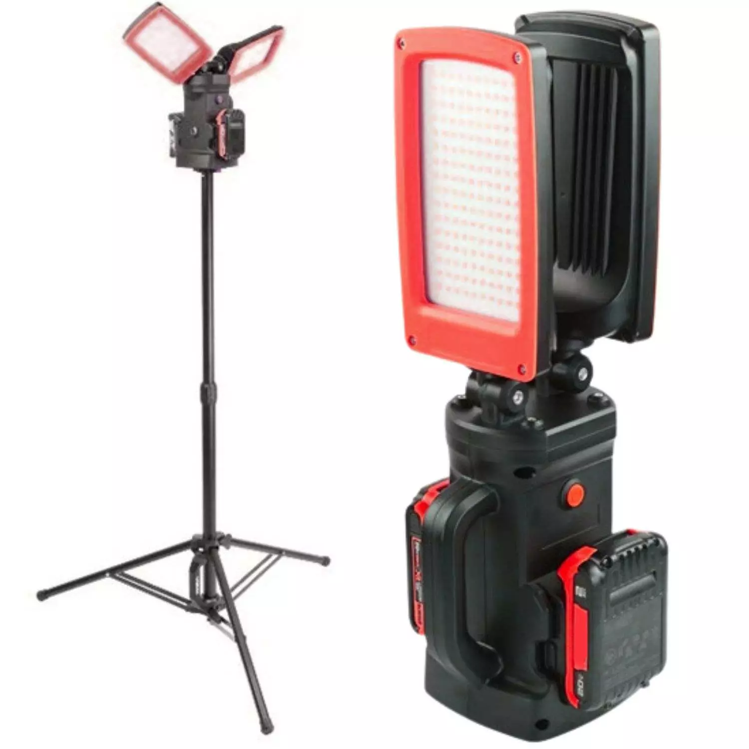 Yhteensopiva MAKITA 18V, DEWALT 18V, MILWAUKEE 18V, BOSCH 18V, ja Jonköping 20V Li-ion akkujen kanssa. 130 cm Tripod telineellä. Toimii kahdella akulla, erittäin tehokas.