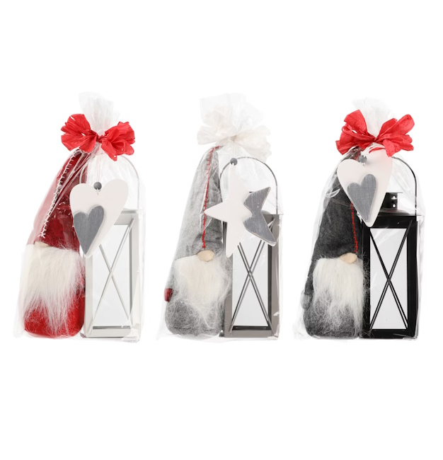 Lahjapakkaus tonttu ja lyhty rusetilla solmitussa paketissa. Lajitelmatuote, toimitus varastosaatavuuden mukaan.