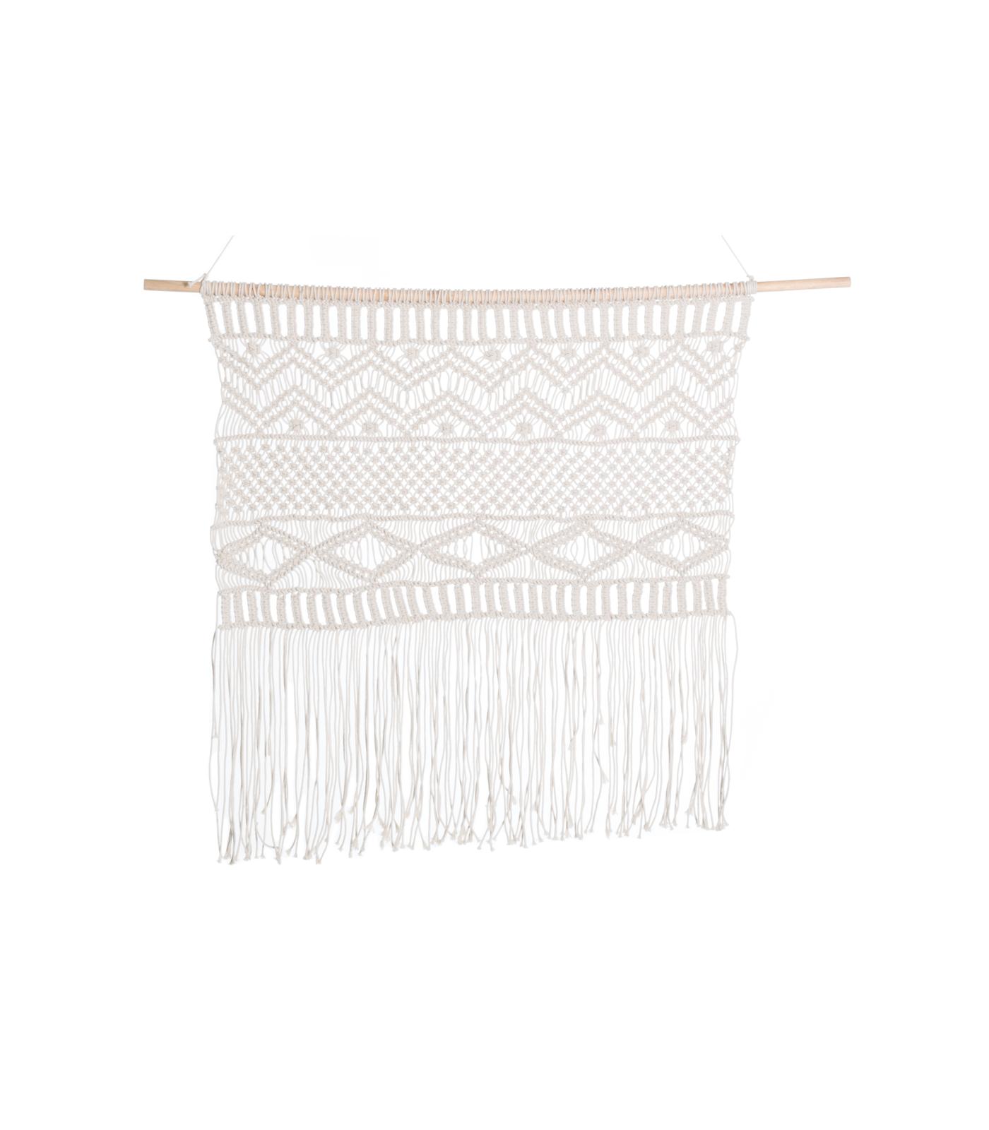 Kaunis luonnonvalkoinen makramee seinävaate ihastuttaa pehmeällä kauneudellaan. Makrameet sopivat täydellisesti sekä moderneihin, että boheemeihin koteihin.