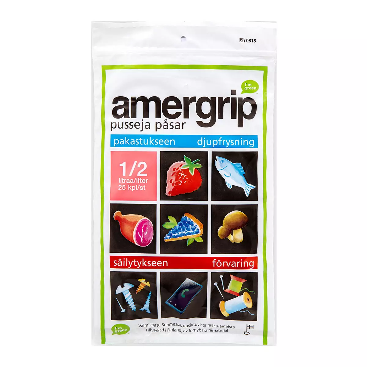 Uudelleensuljettava Amergrip pakastepussi pakastukseen ja säilöntään. Pussi on helppo avata ja sulkea, ja suljin on tiivis myös nesteille. Valkoinen kirjoitustausta on painettu pusseihin valmiiksi, mikä helpottaa sisällön merkitsemistä. 0,5 litran koko sopii pienemmille annoksille, marjoille ja muille pakastettaville elintarvikkeille. Pussit valmistetaan Tampereella, ja niille on myönnetty Suomalaisen Työn Liiton Avainlippu-merkki.