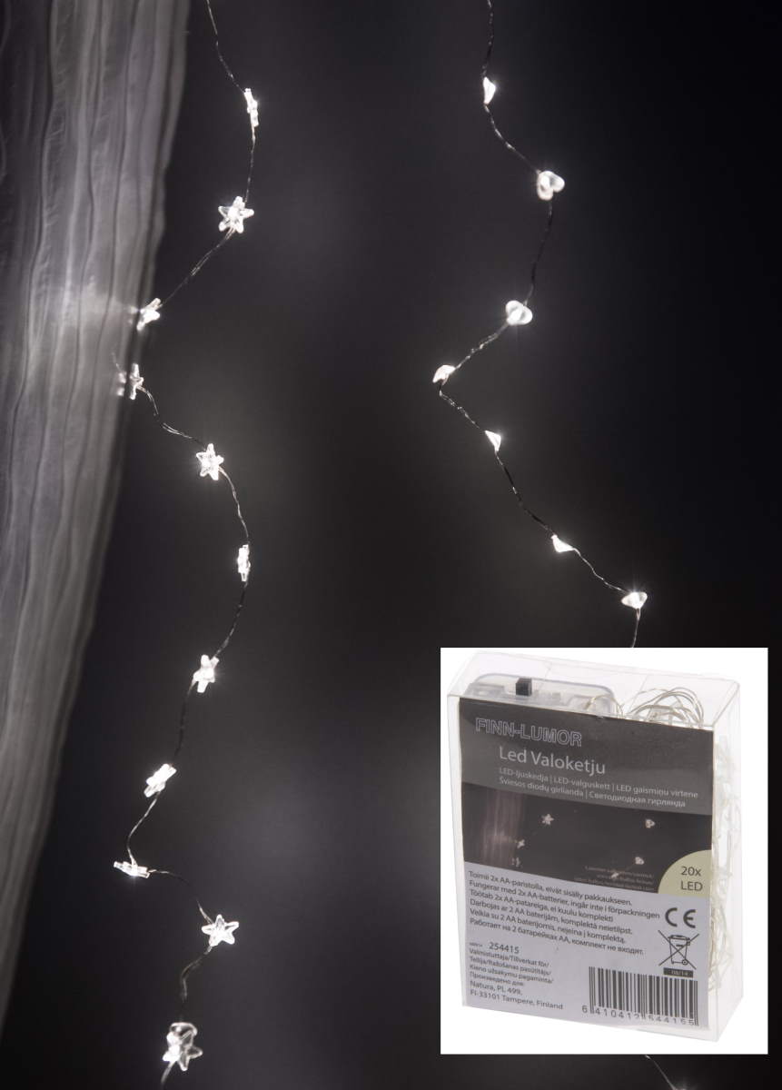 20 kpl LED lämmin valkoinen 3V, 0,06W, 20mA. Hopean värinen kuparilanka. Ledit 5 cm välein, sydän tai tähti koristeet.