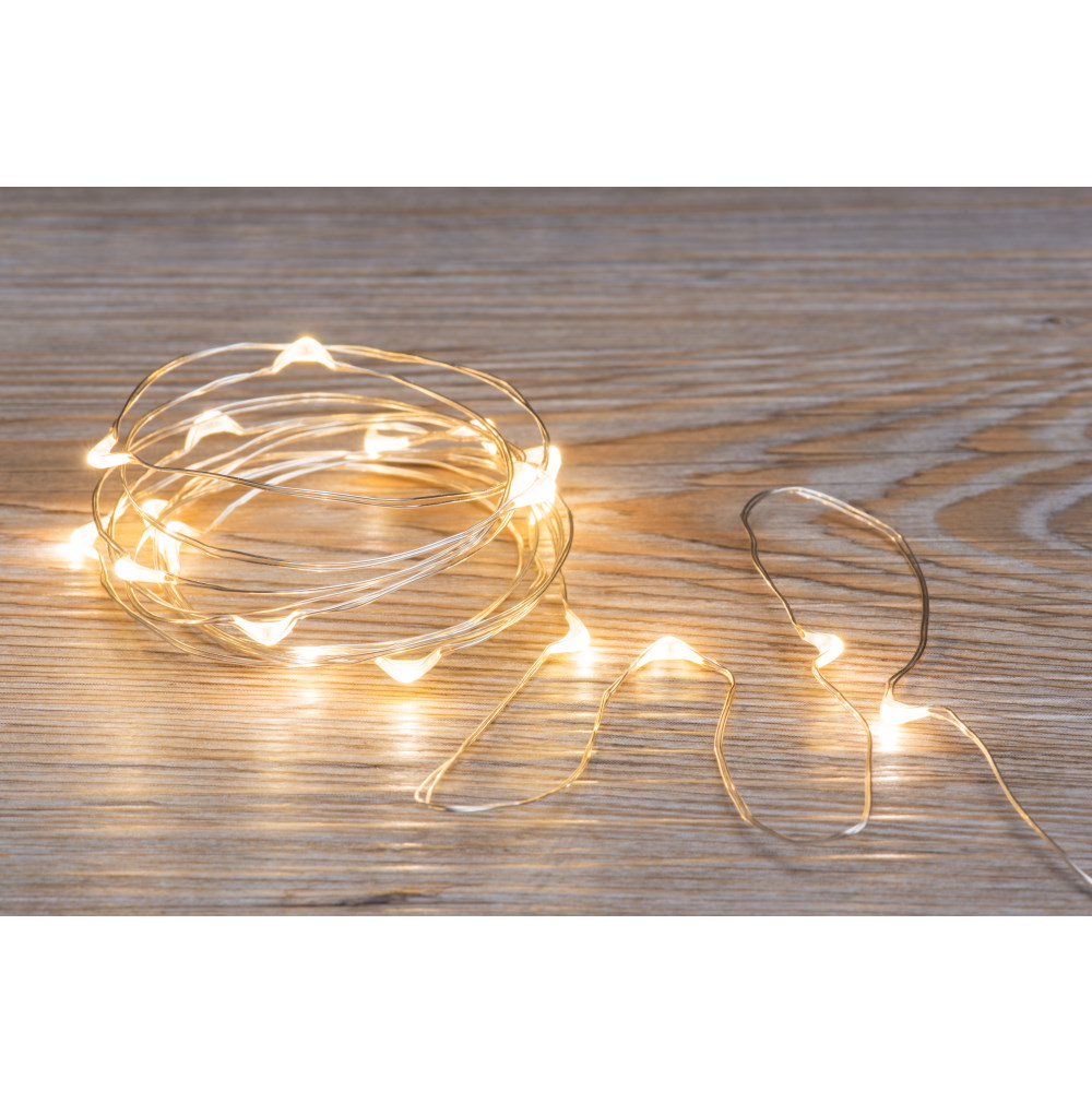 50 kpl lämmin valkoista LED valoa hopealangassa. 6H ajastimella.