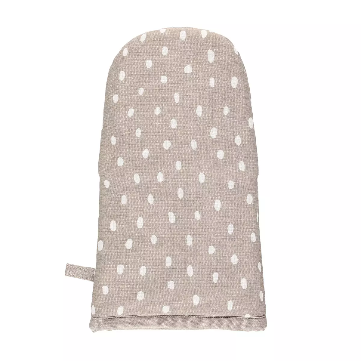 Beige patakinnas, jossa on suloinen valkoinen pilkkukuvio. Kinnas suojaa käsiä kuumuudelta ja on miellyttävä käyttää pehmeän polyestervanutäytteen ansiosta. Tyylikäs ja käytännöllinen lisä keittiöön.