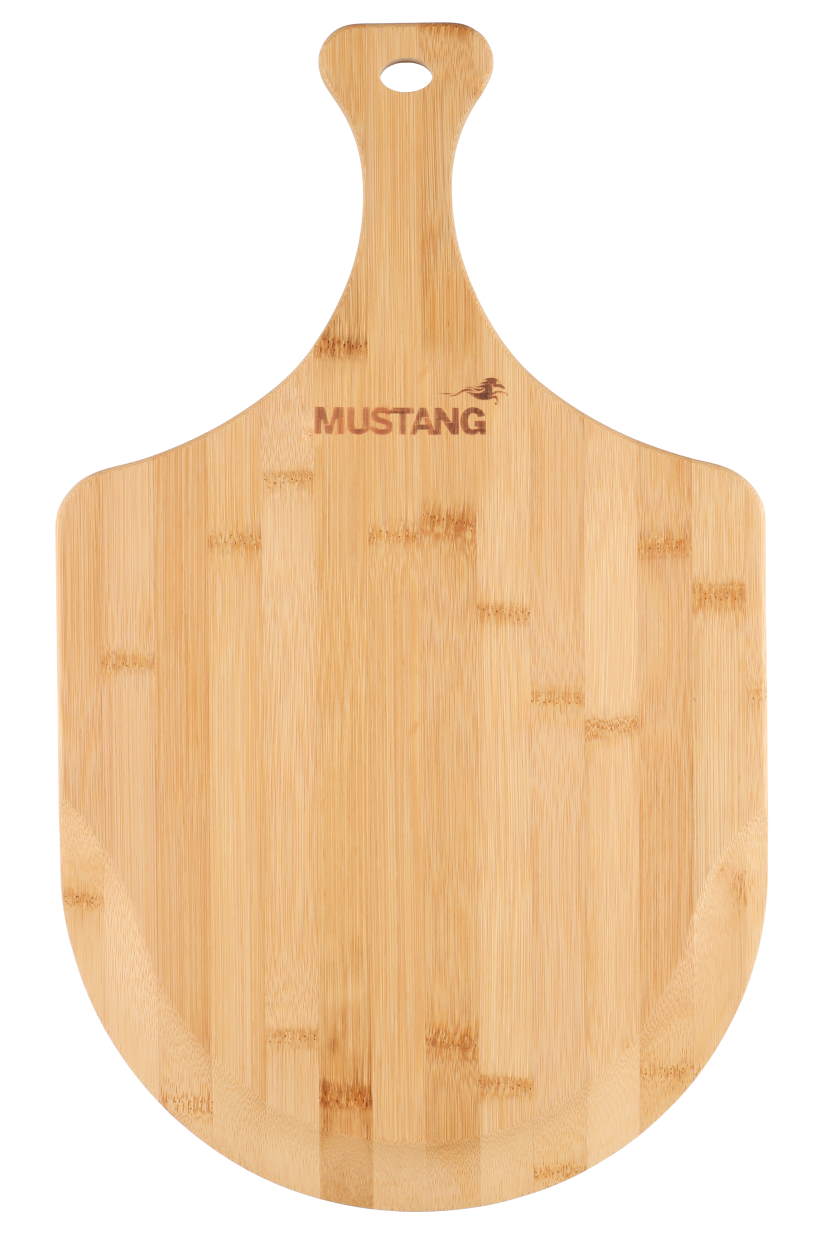 Bambusta valmistettu pizzalapio. Terävä kärki menee helposti pizza alle. Mustang logo.