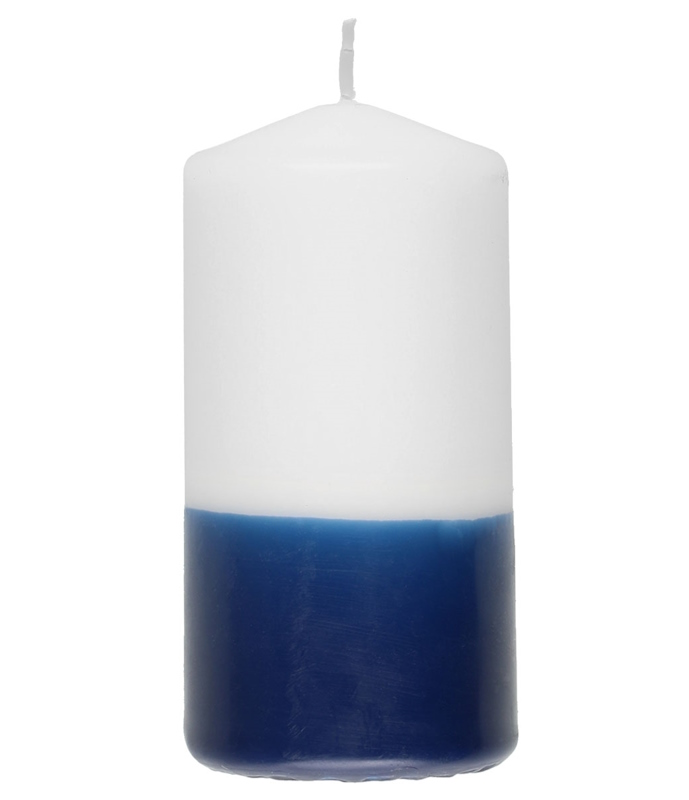 Sinivalkoinen pöytäkynttilä itsenäisyyspäivän juhlistamiseen. Sopii kattauksen koristeeksi ja muuhun teemakoristeluun.