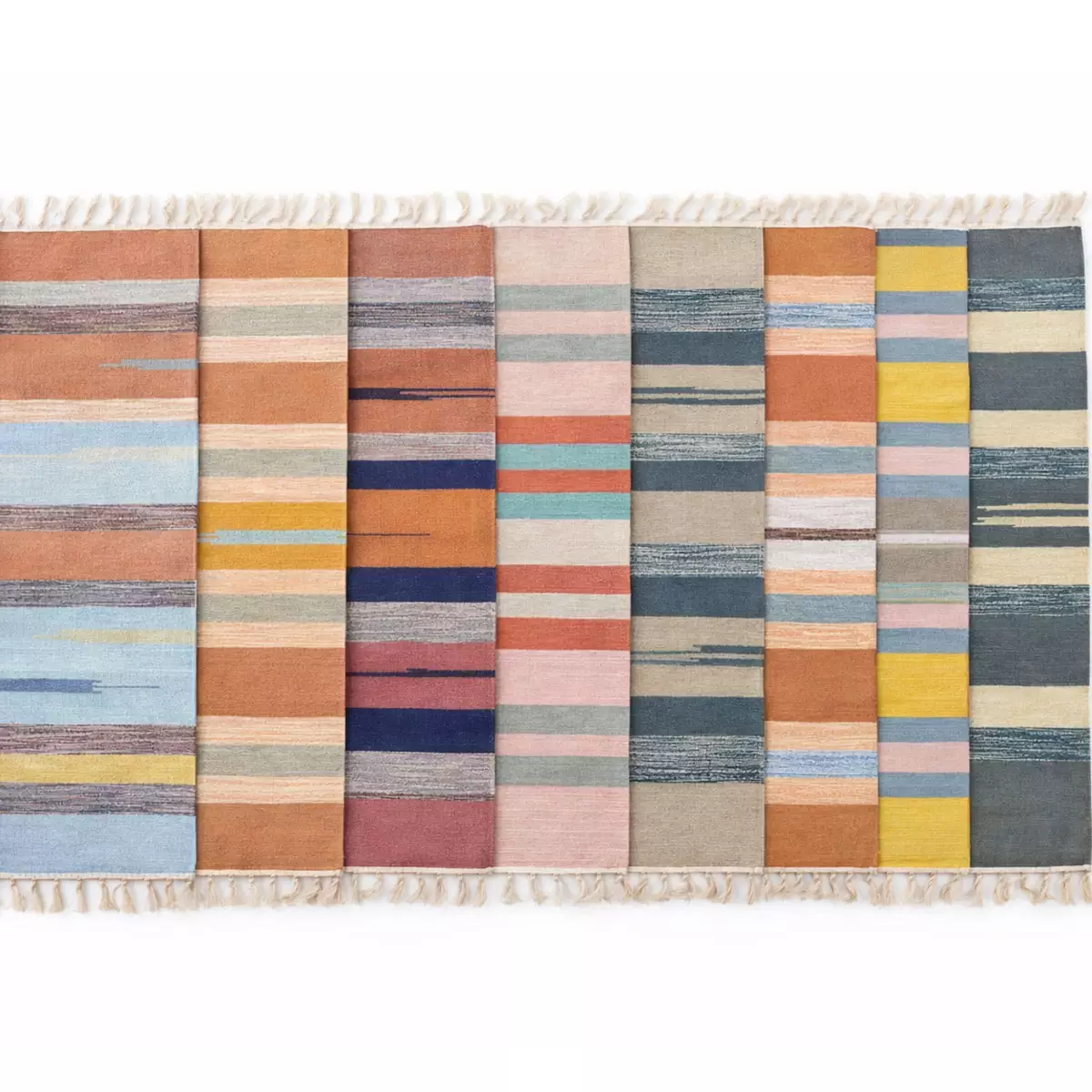 Monivärinen räsymatto tuo tilaan kodikasta ilmettä. Matto on käsinkudottu Intiassa ja valmistettu 100 % kierrätyspuuvillasta ylijäämäpaloista. Jokainen matto on yksilöllinen, joten sävyt ja raidat vaihtelevat. Hapsureunat viimeistelevät perinteisen ilmeen.