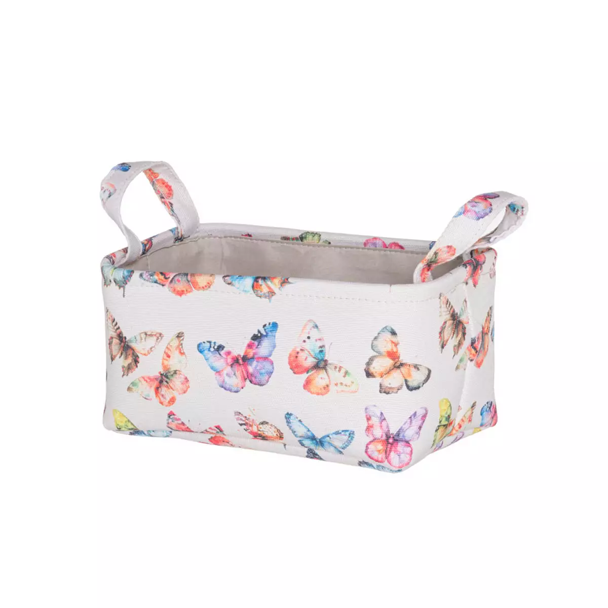 Kankainen säilytyskori värikkäällä perhoskuviolla. Ihanteellinen tavaroille, joiden haluat olevan käden ulottuvilla mutta silti piilossa katseilta. Auttaa järjestämään tavarat ja käyttämään säilytystilan mahdollisimman hyvin hyödyksi. Materiaali päällinen 100 % polyesteri, vuori 100 % polyesteri. Pintapesu kostealla liinalla. Mitat 28 x 18 x 14 cm.