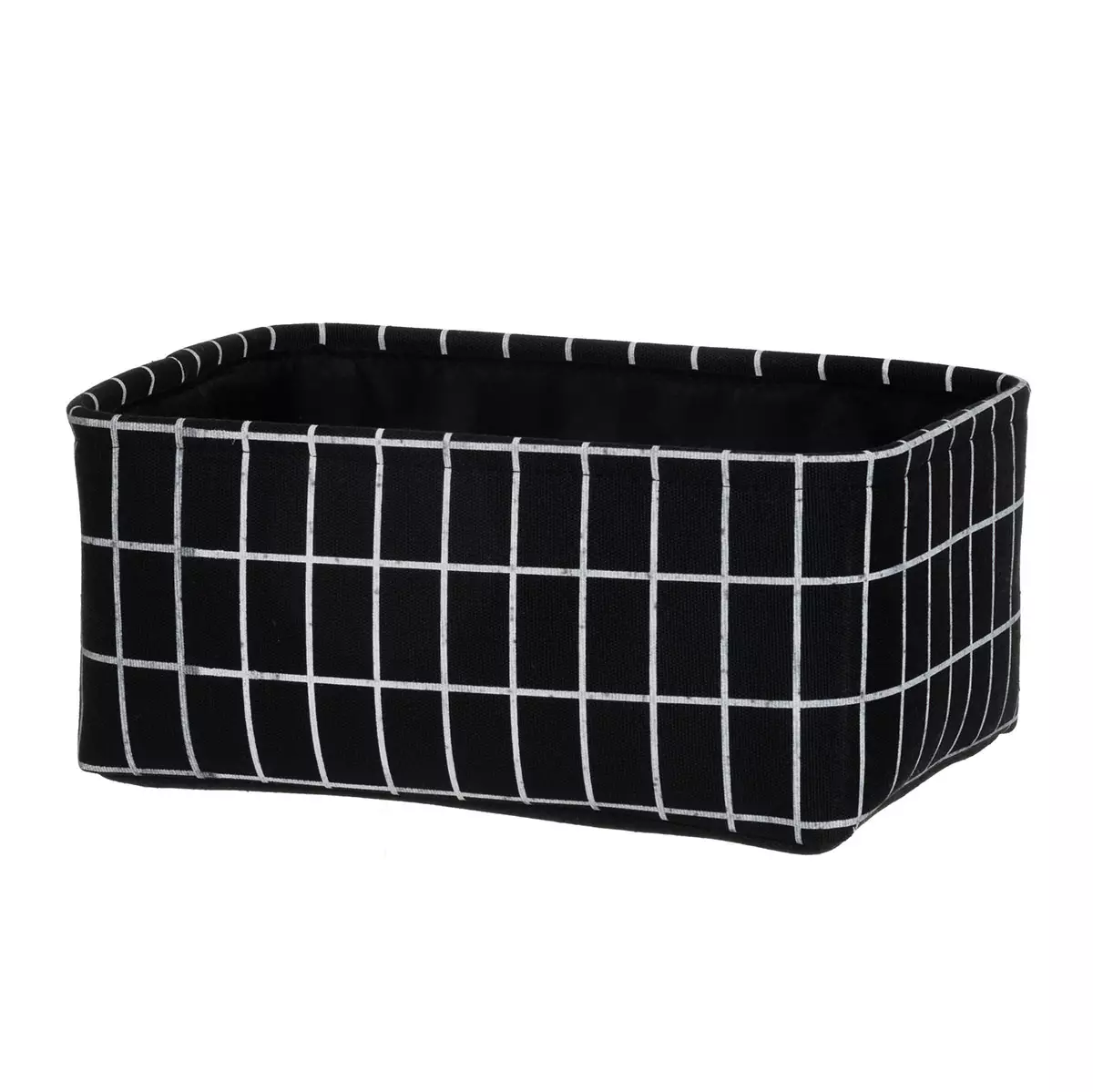 Tyylikäs kangaskori kätkee tavarasi kauniisti ja on samalla käytännöllinen osa säilytysjärjestelmää. Musta kori valkoisella ruudukolla. Materiaali 100 % polyesteri. Pintapesu kostealla liinalla. Mitat 36 x 26 x 16 cm.