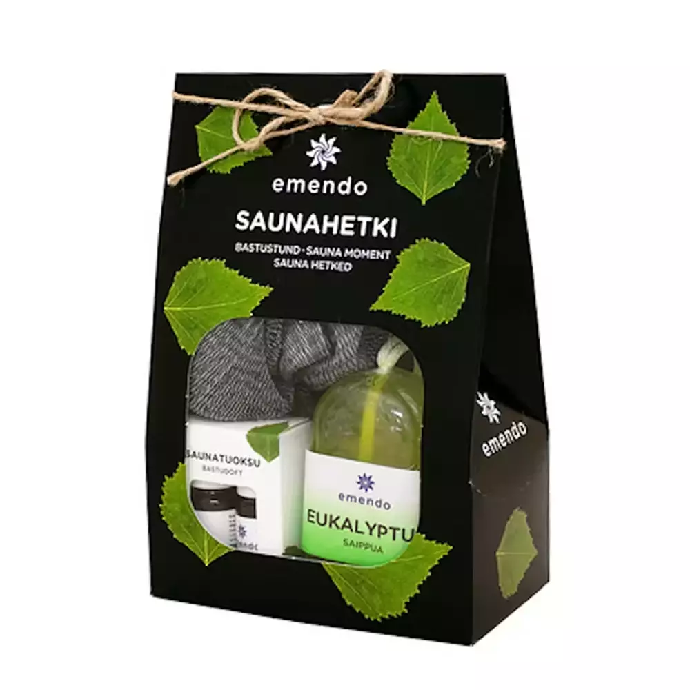 Emendo Saunahetki -lahjapakkaus kokoaa yhteen neljä saunomisen suosikkituotetta. Setti sopii mainiosti lahjaksi tai omaan hemmotteluun, kun haluat tuoda saunahetkeen erilaisia tuoksuja ja perinteistä tunnelmaa. Eukalyptus- ja Savusauna-saunatuoksut antavat löylyihin raikkaita ja pehmeän savuisia vivahteita. Mustavalkoinen pesusukka kuorii ihoa hellävaraisesti ja eukalyptusnarusaippua viimeistelee peseytymisen raikkaalla tuoksulla.
