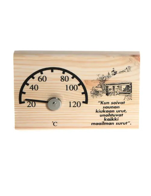 Puinen saunamittari tekstillä "kun soivat saunan kiukaan urut, unohtuvat kaikki maailman surut". Koko 18x12cm.