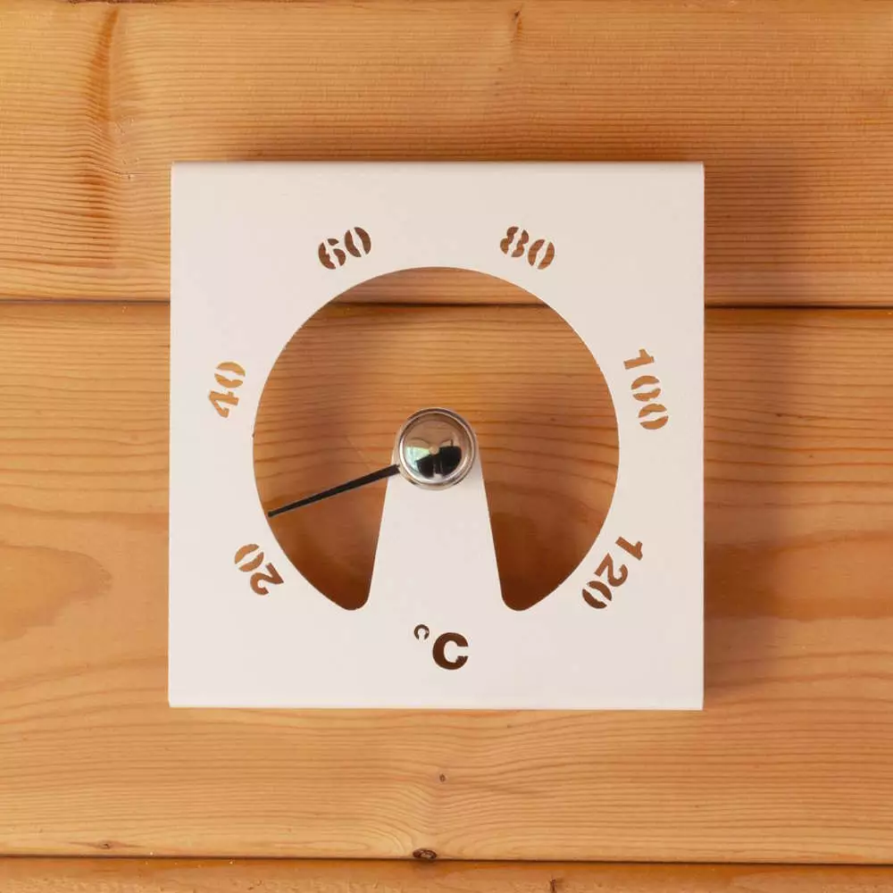 Tyylikäs ja moderni saunamittari. Asteikko 20-120 astetta. Materiaalina maalattu alumiini. Koko 145 x 150 x 35 mm.