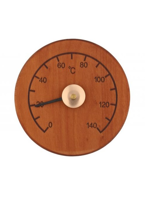 Perinteinen pyöreä puinen saunamittari.