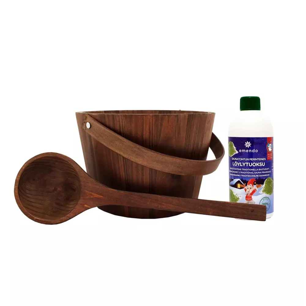 Tyylikäs ja perinteikäs saunasetti tuo löylyhetkiin aitoa tunnelmaa. Kiulusetissä on ruskea puinen saunasanko ja siihen sopiva puukauha sekä suosittu Saunatontun perinteinen löylytuoksu, joka viimeistelee saunakokemuksen miellyttävällä tuoksullaan. Lisää löylyveteen ripaus tuoksua ja nauti pehmeistä, perinteisistä löylyistä. Setti sopii erinomaisesti omaan käyttöön tai lahjaksi saunan ystävälle.
