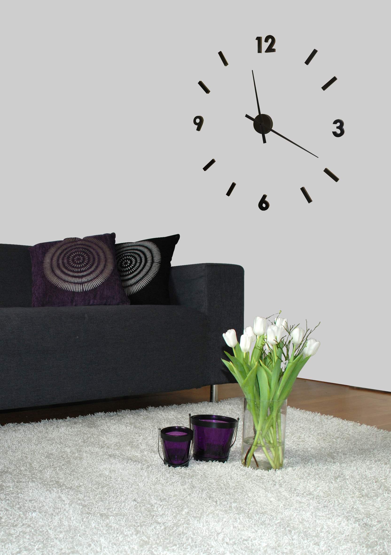 Liimattavat numerot voit asettaa joko pyöreäksi tai neliöksi tai minkälaiseen muotoon itse tahdotkin. Kuvassa näkyvä ympyränmallinen asetelma on halkaisijaltaan 60cm. Viisareiden pituus on 45cm, ja liimattavan numeron korkeus 8cm.
