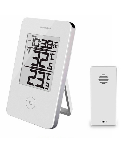 Langaton digitaalinen sisä/ulkolämpömittari kellolla, joka voidaan asentaa seinälle tai pöydälle.