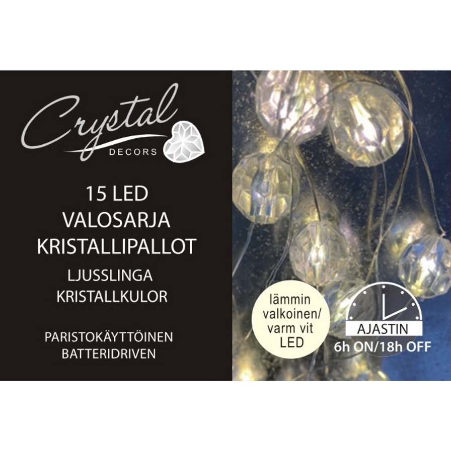 Paristokäyttöinen LED - KRISTALLIPALLO valosarja, 15 lämmin valkoinen led, kristallipallon koko 1.6 cm, hopeisessa metallilankajohdossa, lampunväli 5 cm, kirkas liitosjohto 30 cm, 2xAA paristot ei sis., AJASTIN 6/18H