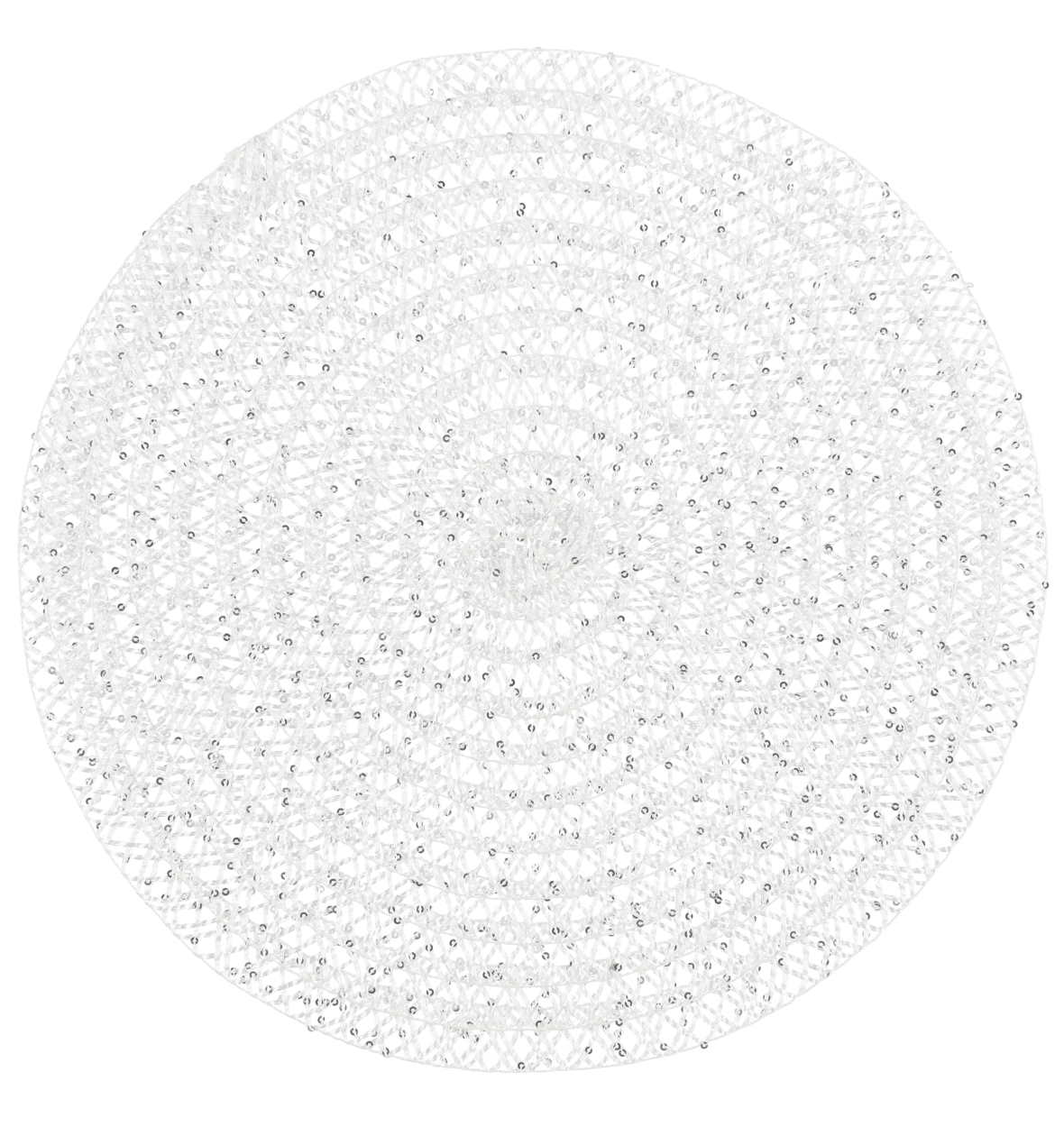 Kaunis punottu pöytätabletti, jossa on paljetteja. Pöytätableteilla saat kotiin uuden ilmeen nopeasti ja helposti ja luot upeaa vaihtelua kattaukseen niin arkena kuin juhlanakin. Pöytätabletit myös suojaavat pöydän pintaa roiskeilta ja naarmuilta.