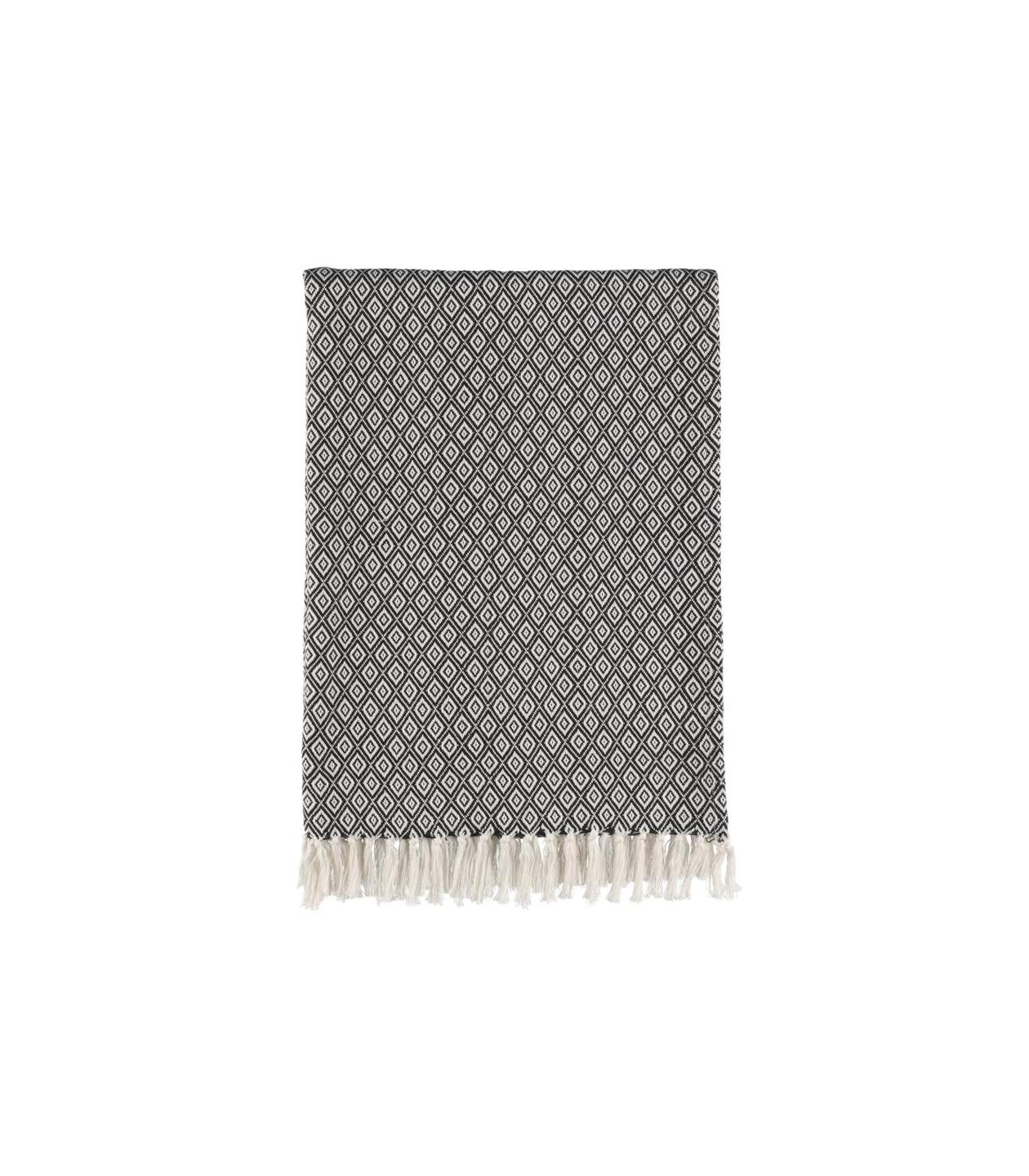 Tyylikäs mustavalkoinen hanhensilmäkuvioinen torkkupeitto. Koski-torkkupeitto tuo sisustukseen raikasta graafisuutta.