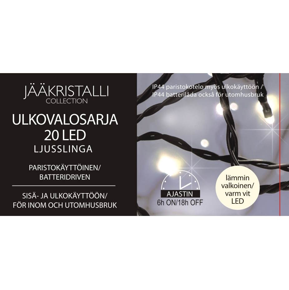 Paristokäyttöinen Ulkovalosarja 20L, lämmin valkoinen Led, 10cm lampunväli, 50cm liitosjohto, valo-osuuden pituus 1.9m, kok.pituus 2.4m, 3xAA -paristot, ei sis., IP44 paristokotelo, musta johto, AJASTIN 6/18H