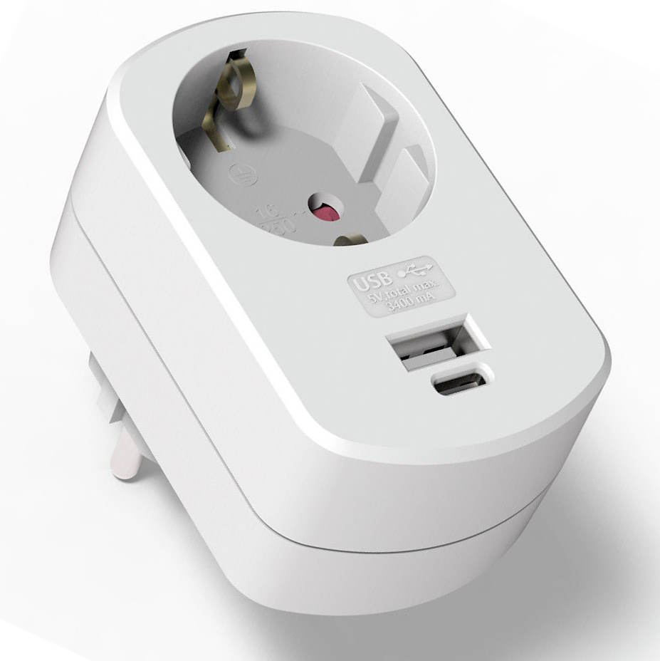 Kätevä USB-adapteri / haaroitin, jossa yksi USB-A sekä yksi USB-C liitin, lisäksi yksi schuko-pistokepaikka. Adapterin avulla voit esim. käyttää ja ladata useampaa laitetta kerrallaan.