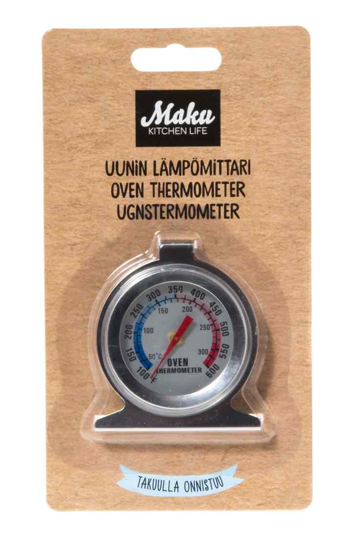 Tarkka ja selkeälukuinen uunin lämpömittari esimerkiksi leivinuuniin tai normaaliin kotiuuniin.