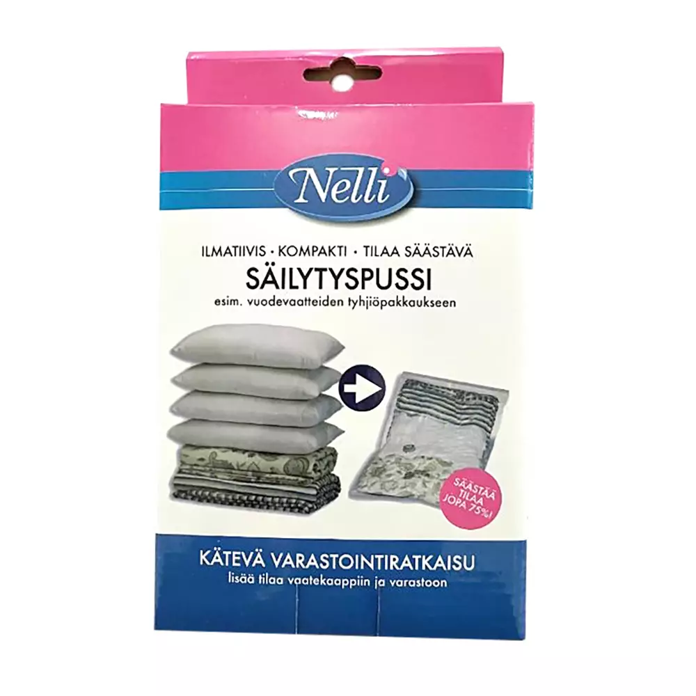 Nelli vakuumi säilytyspussi on kätevä ratkaisu vaatteiden, vuodevaatteiden ja tekstiilien tilaa säästävään säilytykseen. Vakuumipussi poistaa ilman tehokkaasti imurin avulla ja pienentää säilytettävien tekstiilien tilavuutta jopa merkittävästi. Erinomainen valinta kaappiin, varastoon tai muuton ajaksi. Kirkas materiaali helpottaa sisällön tunnistamista, ja tiivis suljenta suojaa tekstiilejä pölyltä, kosteudelta ja hajuilta.