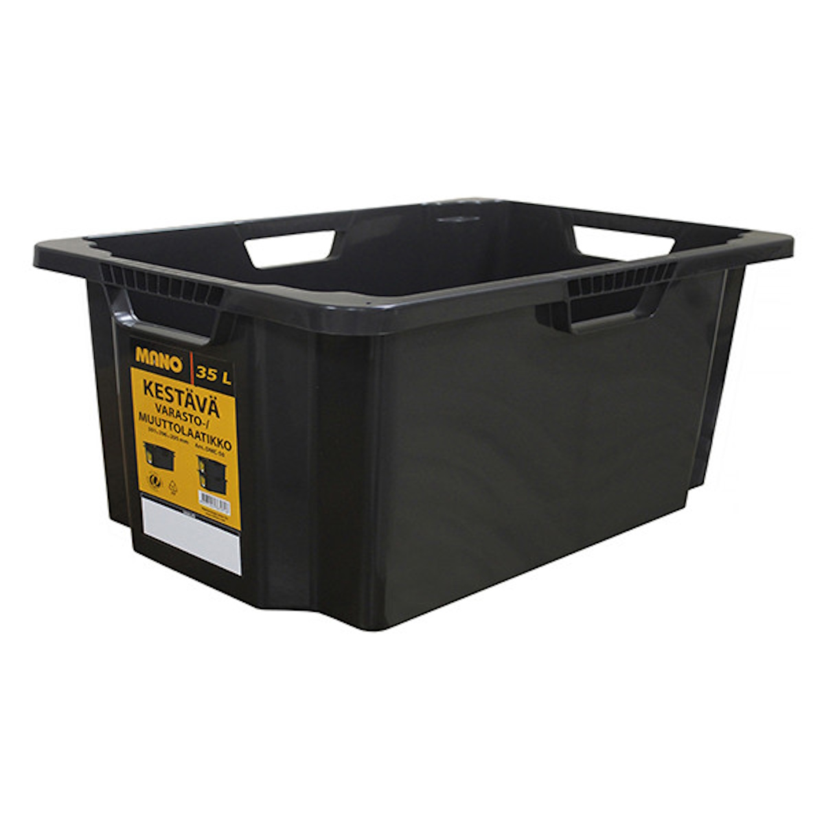 Manon musta 35 litran laatikko on erittäin kestävä ja se on valmistettu kierrätysmuovista. Laatikot ovat pinottavissa sekä sisäkkäin että päällekkäin.