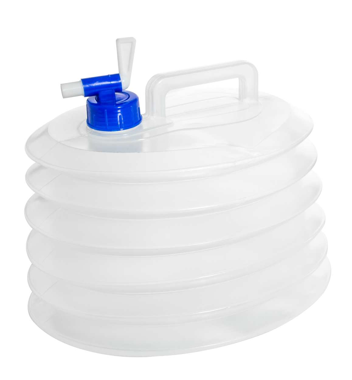Kätevä muovinen juomavesikanisteri, jonka saa tyhjänä taiteltua pieneen tilaan.