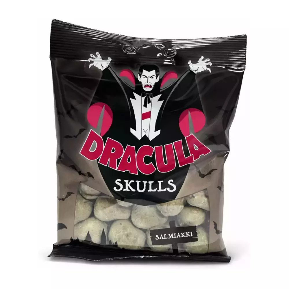 Dracula Skulls Salmiakki on hyytävän herkullinen salmiakkikarkki, joka hurmaa vahvalla ja täyteläisellä maullaan. Hauskat pääkallon muotoiset karkit tekevät herkutteluhetkestä entistä mielenkiintoisemman. Dracula Skulls -pääkallot tarjoavat klassisen salmiakkielämyksen kaikille salmiakin ystäville. Täydellinen valinta naposteluun tai jaettavaksi.